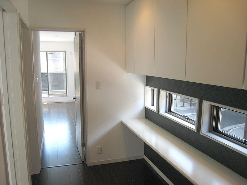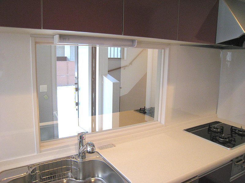 このお家の面白いところは、写真で見て頂くとお分かり頂けると思いますが、キッチンから玄関方面が見える窓があり、しかし、玄関側からはキッチンの中が見えない、マジックミラーの様になっていることです。ですので、子供さんがお友達を連れてきて、お母さんに挨拶をせずに、2階の子供部屋に上がったとしても、お母さんは既に、玄関からお友達が入ってきたところを見ているので、どんなお友達かが分かります。